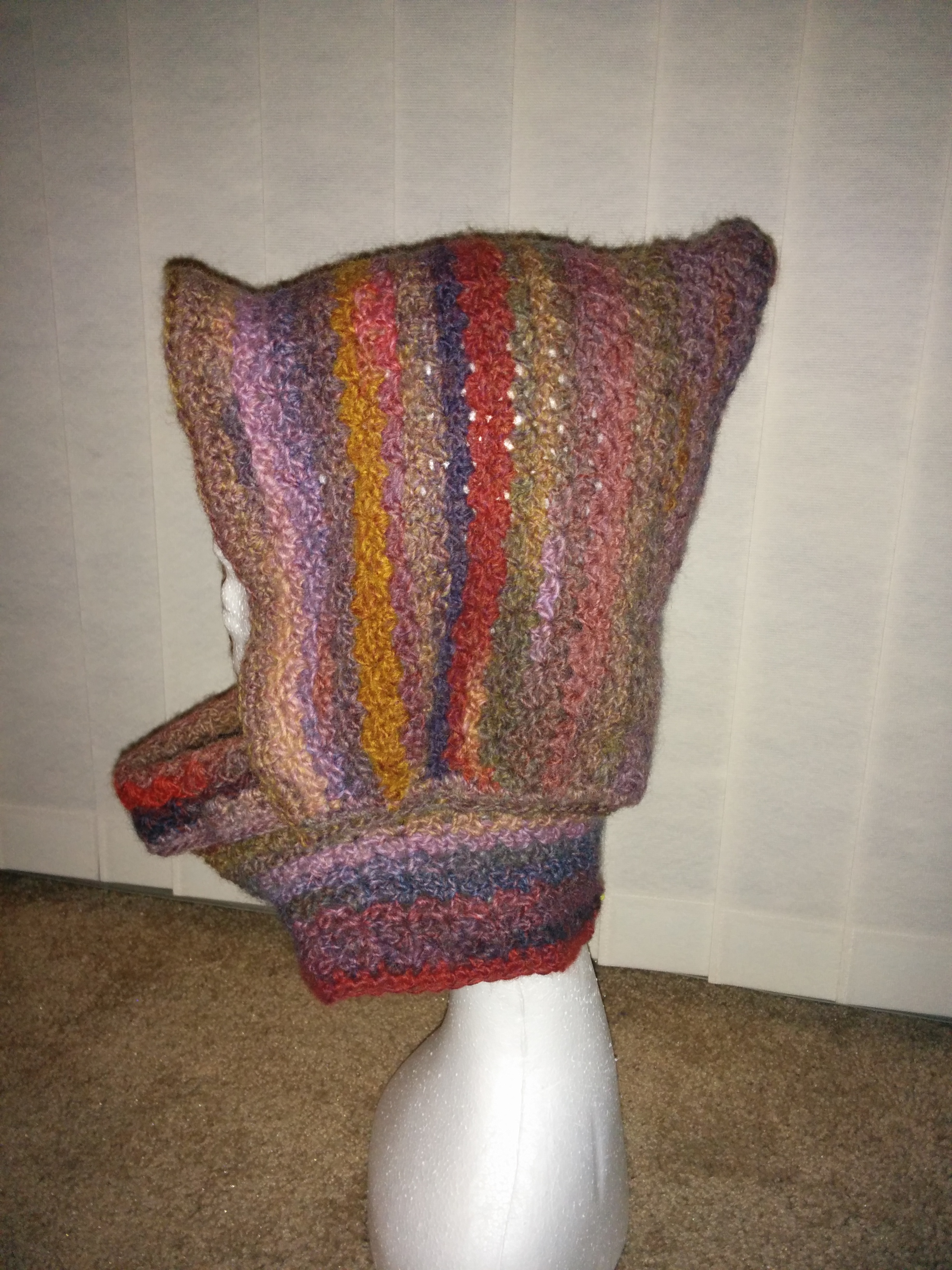 Naturally, this means that I’m crocheting more than ever. I’ve come to the conclusion that crochet is just about the only thing that keeps me sane when the rest of my life is otherwise consumed with writing this dense and detailed document that only five people are ever likely to read. (Six if I can goad my husband into pursuing the finished text.) I have decided, perhaps unwisely, that each member of my committee will get a small gift. I crocheted a hooded cowl as an experiment a couple weeks ago, but am not entirely satisfied with the result. I can’t decide if the cowl is cute or obnoxious. It certainly looked cuter in the original pattern, though I opted to dispense with the edging she uses.