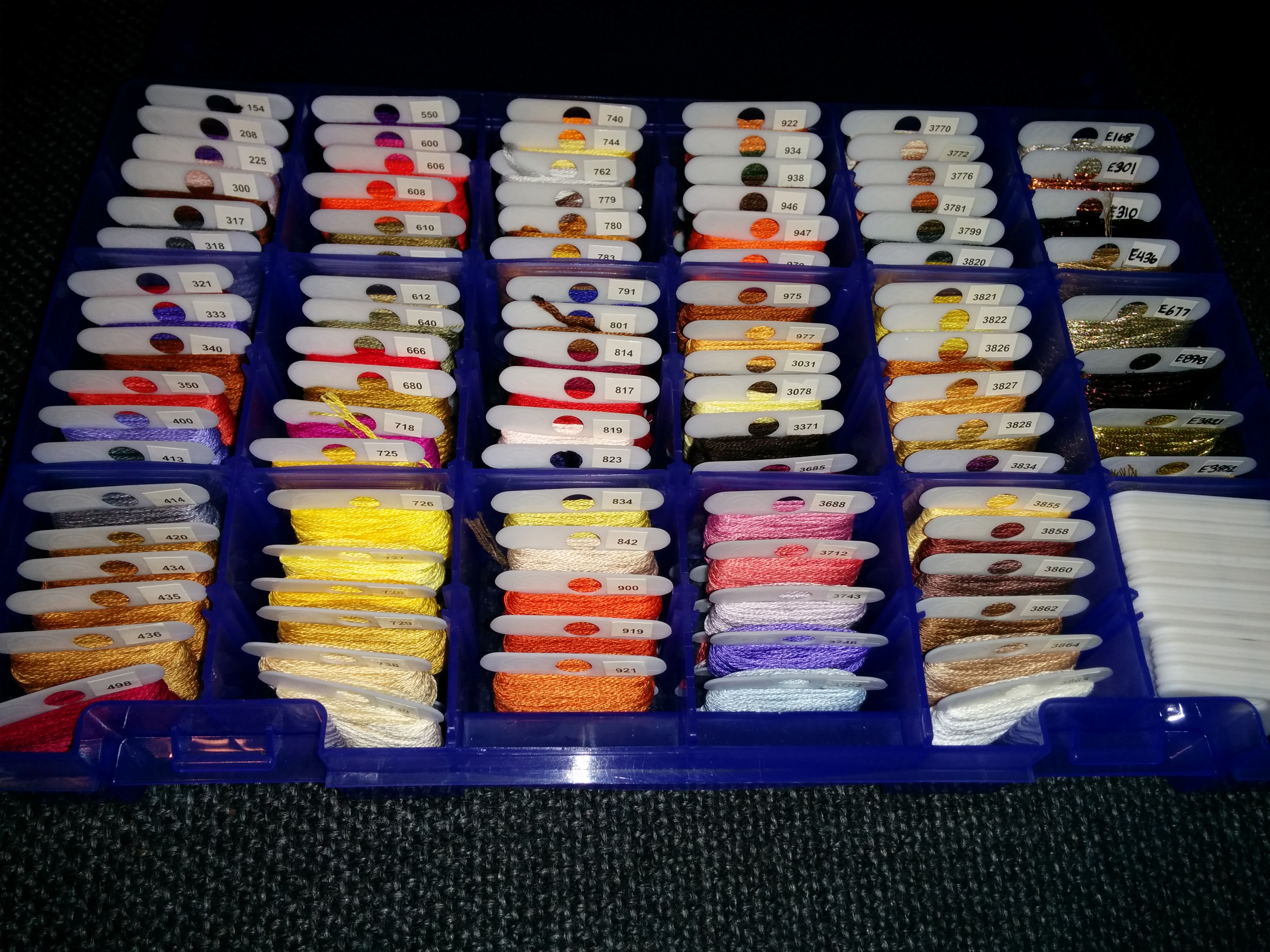 Despite the fact that I’ve been working on my new project like a complete Ganondork (geddit?), the majority of my time has been spent doing the thing I both love and loathe the most: organizing. Friday night was spent shopping for and organizing my floss for this project. Now, I’m not a terribly organized person in my day to day life. My desk is generally littered with the detritus of my most recent work project, a magazine, and the last week’s mail. My kitchen always has clean pots on the counter because I can’t be bothered to put them away. My craft materials, on the other hand, are ruthlessly sorted and labeled. Yarn goes into bins by either use (amigurimi acrylics, wool skeins, hat materials) or by project (that Cthullu blanket that I really need to get around to making, that sweater I promised my mom two years ago, that afghan I started for my advisor last year…). My floss is also sorted, placed in numerical order, and kept in its own project specific box. This is the result of last night’s organizational frenzy: