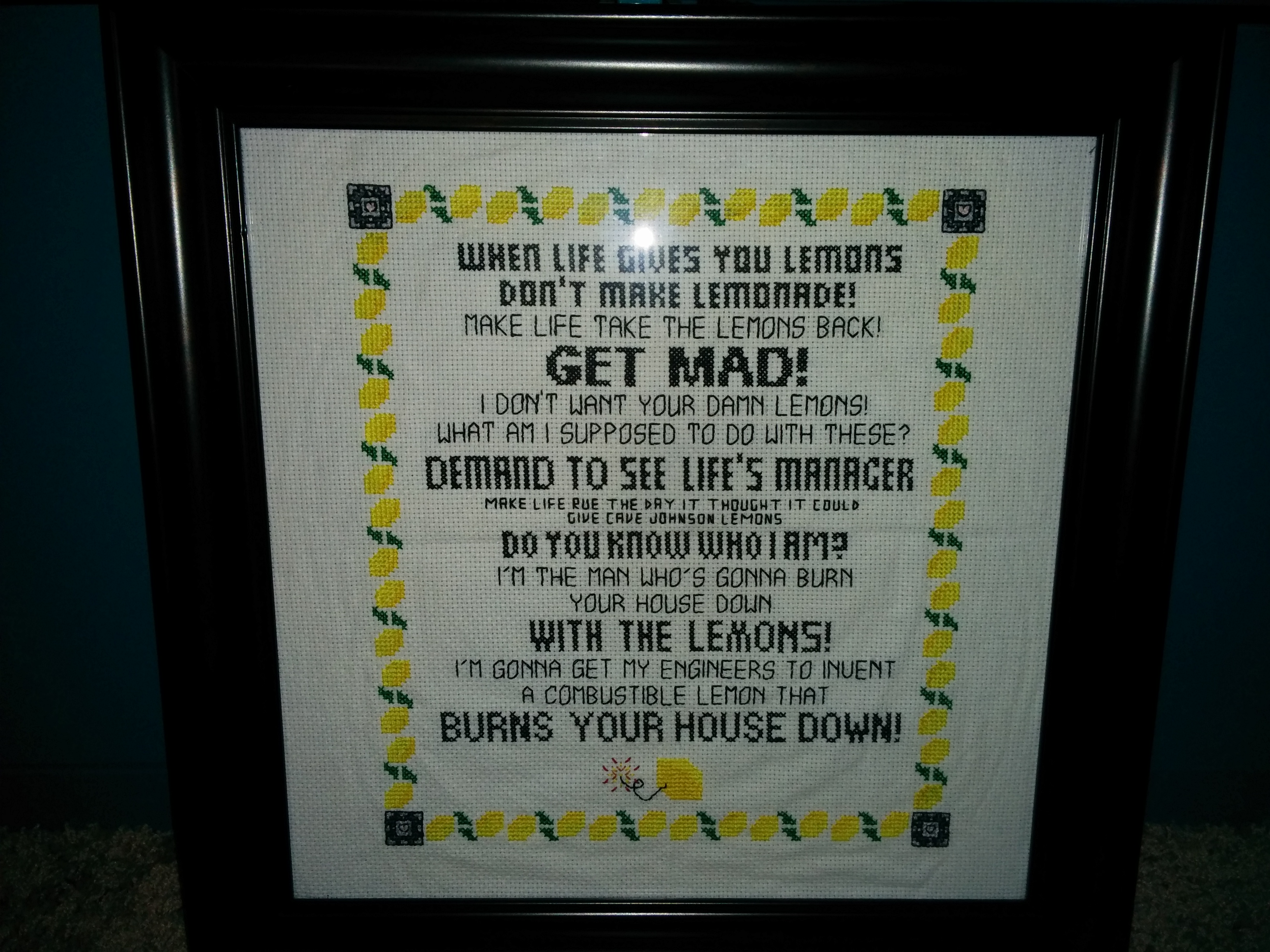It’s been a busy week here in the Butterscotch household. The start of a new semester (2 weeks ago) heralded the lighting and subsequent extinguishing of many, many fires at work, so I’ve been putting in some late nights. I have, however, finally completed my Portal 2 project. That’s it below, all framed up and ready to go to work on Monday. It’ll make a nice addition to my dijonaise colored cubicle.