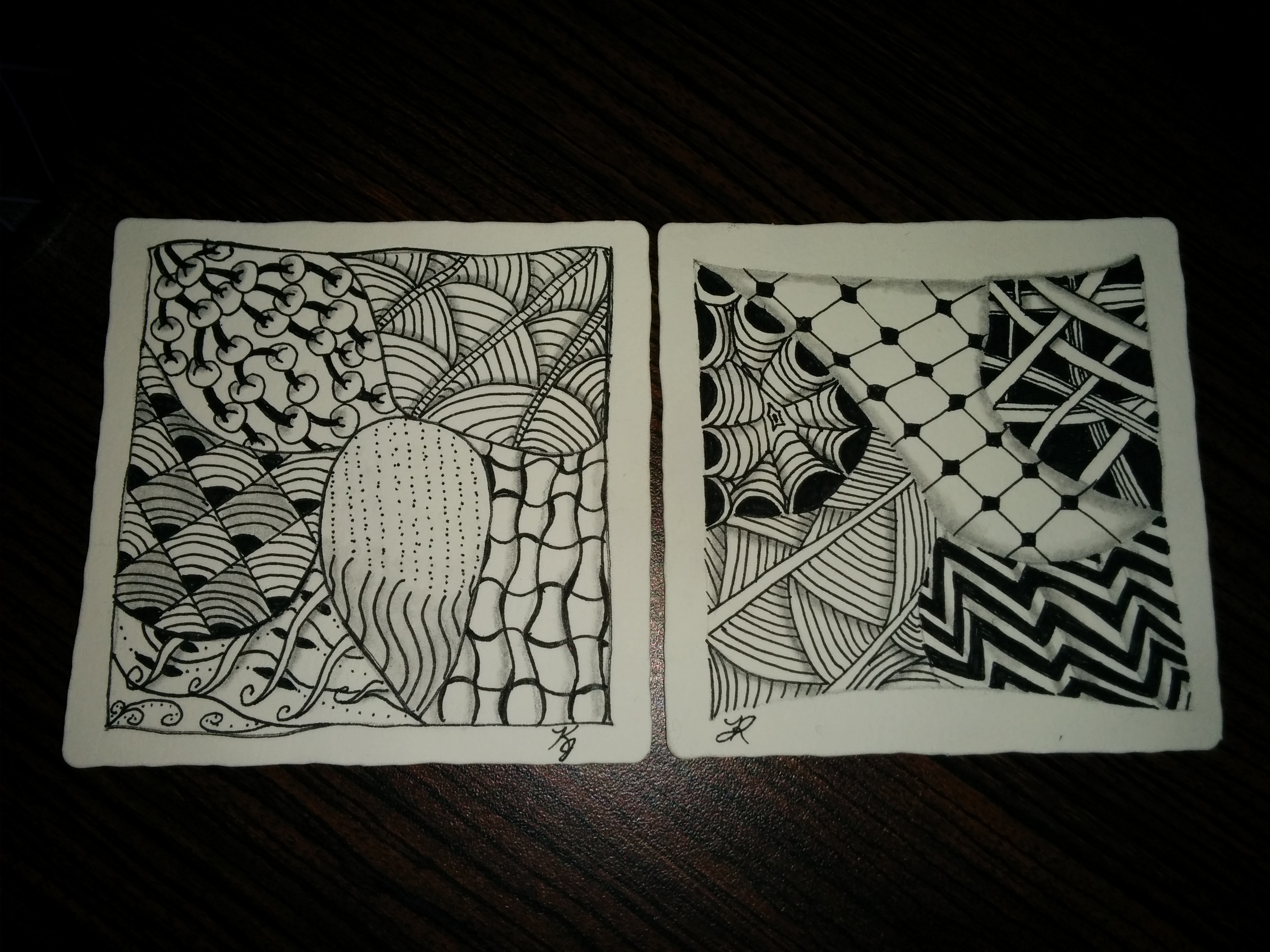 Here are some of my results. The Tangle on the right was my class piece; the one on the left was the one that I did at my desk while on a lengthy phone call with a client.