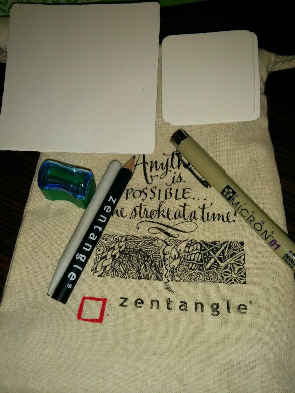 It turns out “Zentangling” is a form of structured,”no-mistakes” doodling. And it’s surprisingly fun! We were given small gift bags that contained some Dove chocolate (not pictured because I ate it), a pencil sharpener, coaster and postage stamp-sized pieces of watercolor weight paper, a lovely Sakura 01 pen, a smudge stick, and a soft graphite pencil. Our CZT (Certified Zentangle Trainer), Paula, walked us through the basics of Zentangle: