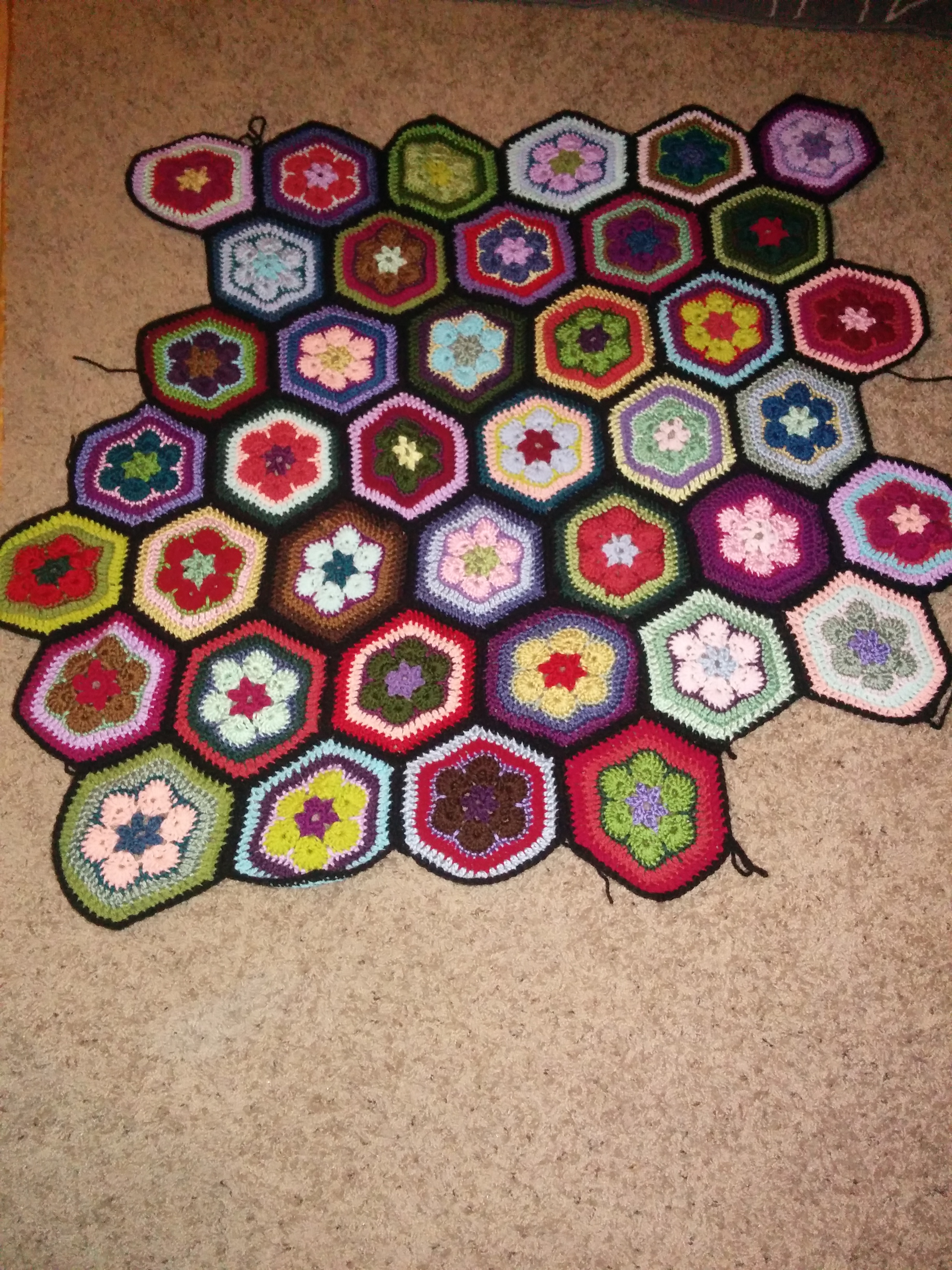 My other blog, a cultural criticism blog co-written with a good college buddy, went on hiatus for spring break, so I put my extra time into the AFHS this week. I managed to make 20 hexes (heh. hexes. How positively Macbethean.) and whip stitch them into the growing whole.  Progress photo below.