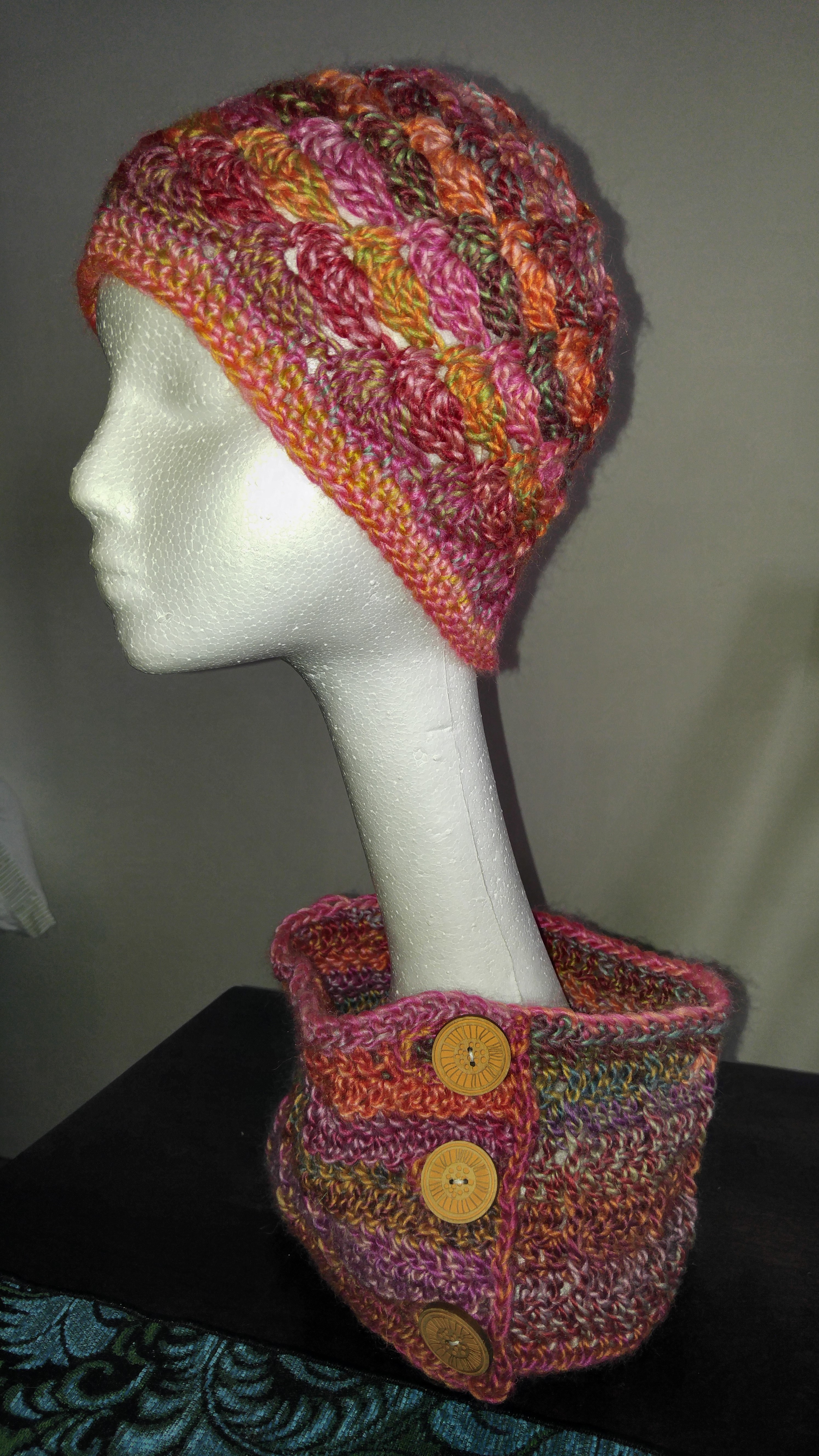 I have made a number of things. I recently got into buttons in a big way, so I’ve been making buttoned cowls for the past few weeks. These are a few examples: