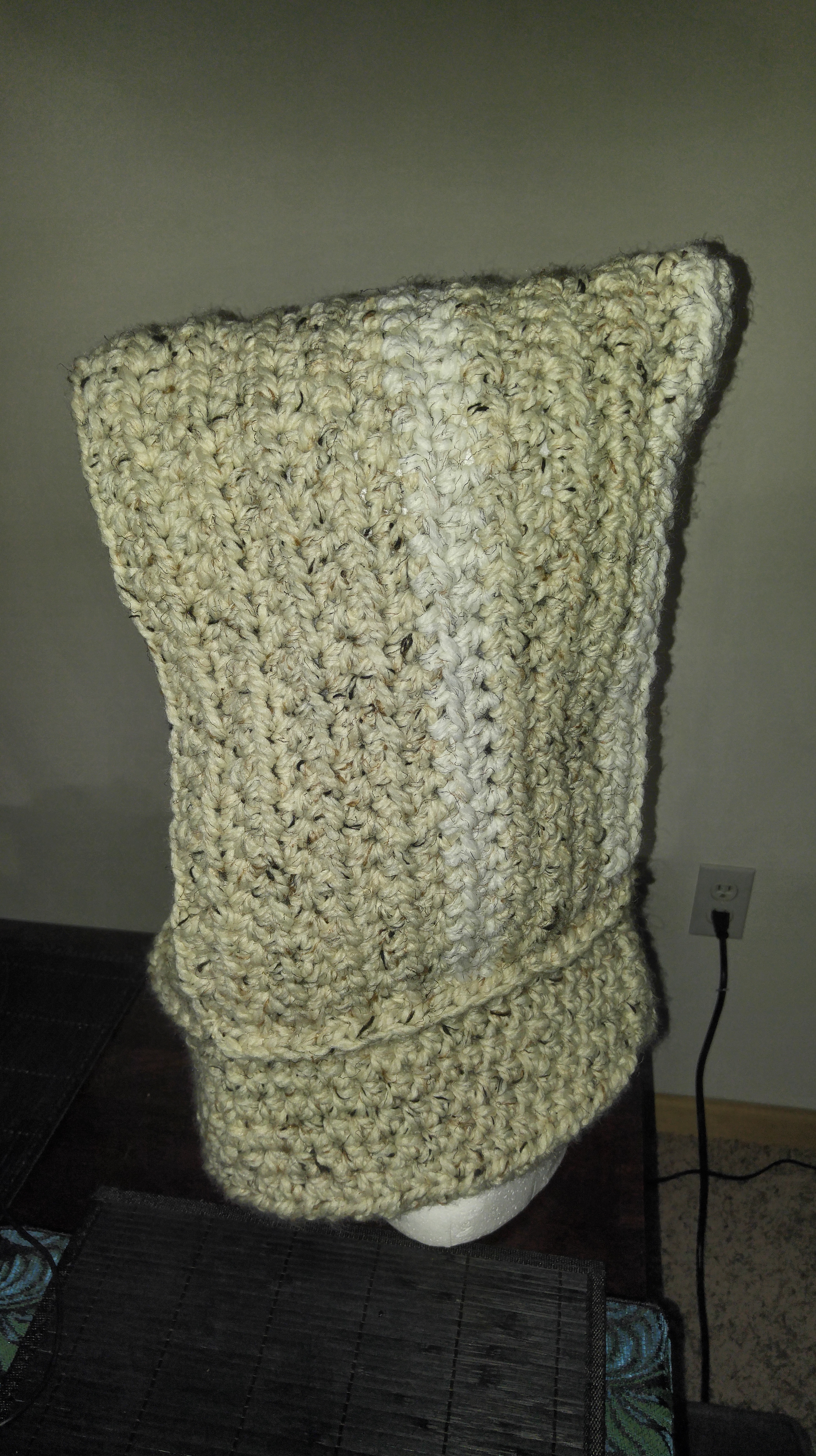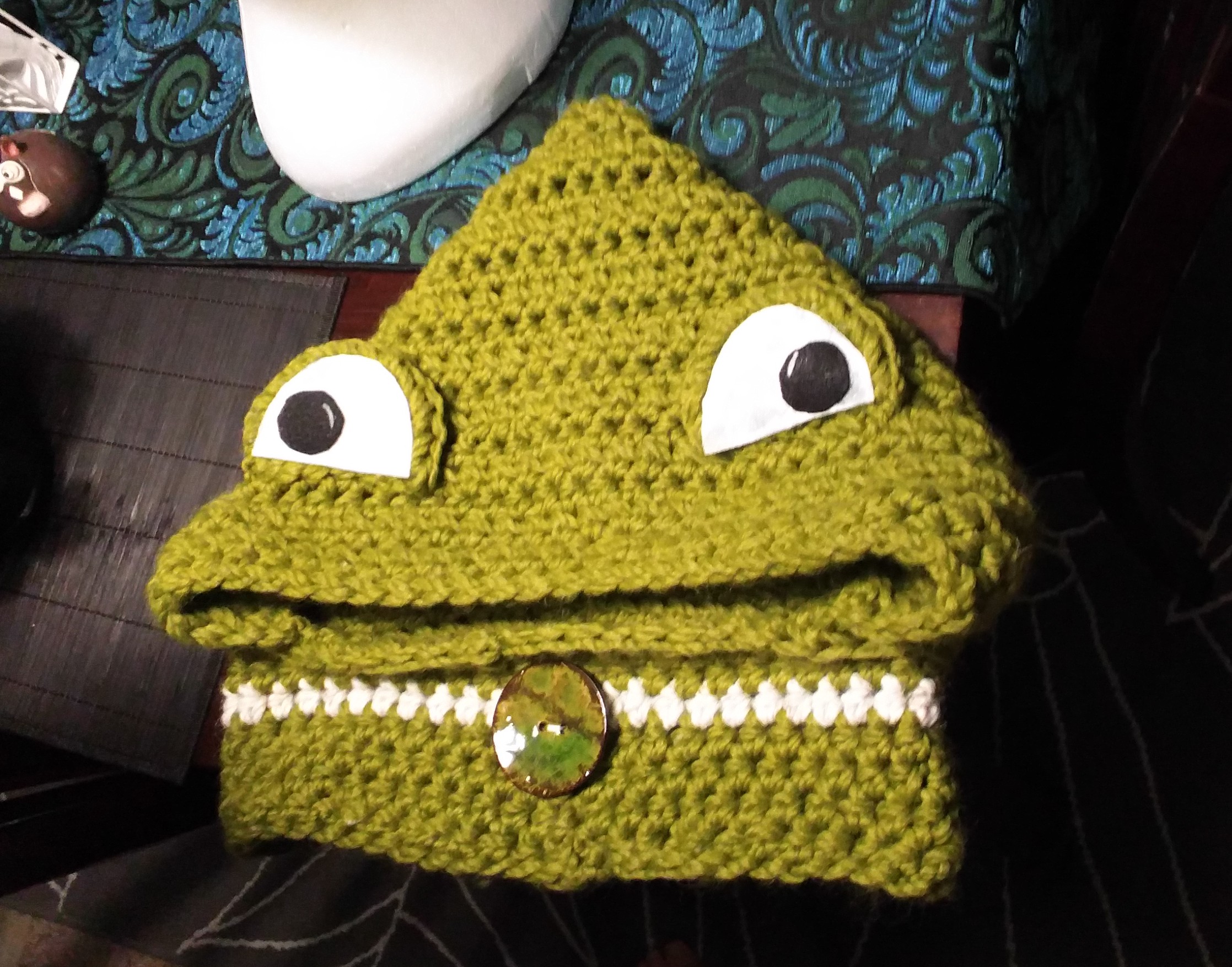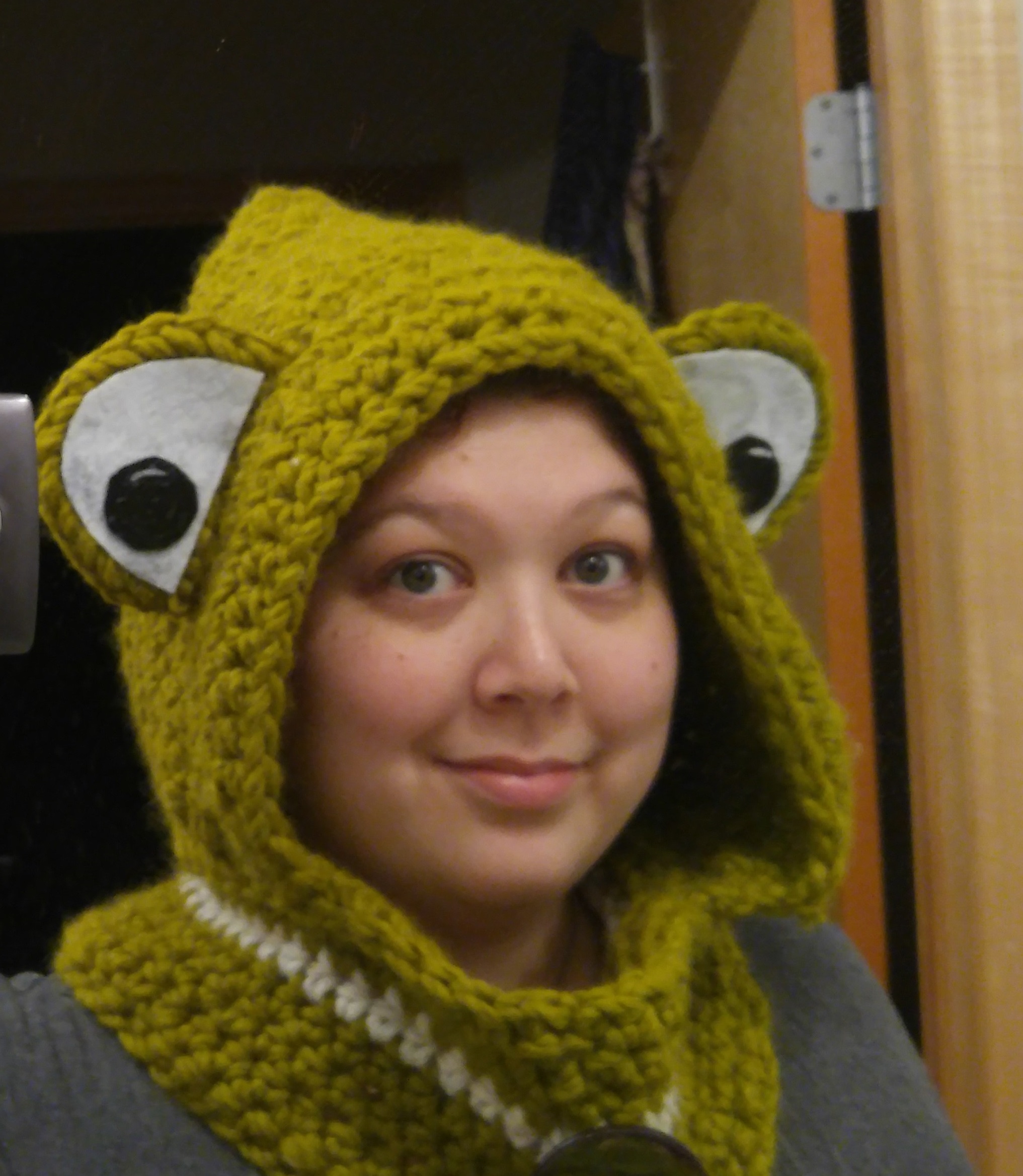 I also got a bit adventurous and made one of the lovely chunky animal cowls I’ve seen floating on Pinterest. I opted for a frog for my first foray into cowl making (frogs are kind of my totem animal), and I have to say he’s pretty darn cute.